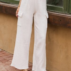 Elastic Waist Two Side Cargo Pockets Wide Leg Fit Non Stretch